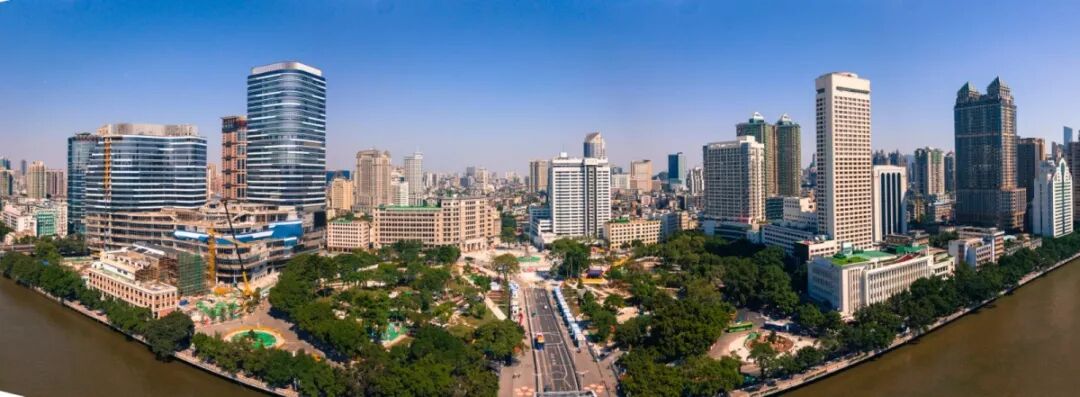 以广州解放纪念雕像为核心,通过铺装串联8栋建筑地标、2处城市公园(海珠广场东、西园),北延传统中轴、南连珠江水岸,打造开放性市民滨水文化广场。
